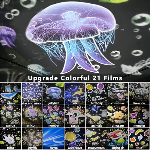 【21 Types of Films】21 sets of scenes: Whale, Jellyfish, Star and Moon, Unicorn, Singing Girl, Elk, Dinosaur, Aurora, Birthday, Color Planet, Fruit, Transportation, Animals, Christmas, Castle, Fireworks, Number, Panda, Monster, Big Jellyfish, Rabbit. The projector creates a wonderful atmosphere, and the projection films ensure that all projections are beautiful and can stimulate children’s curiosity and imagination. By changing the projection film every day, the entire room transforms into a dream-like world.