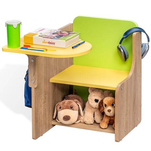 GREAT STORAGE: This chair desk has a cup and stationary groove on the desk to keep your art supplies organized. It also has a storage space under the seat where you can keep your books, toys or more art supplies. Additionally, there’s a side knob on the desk that you can use to hang the school bag.