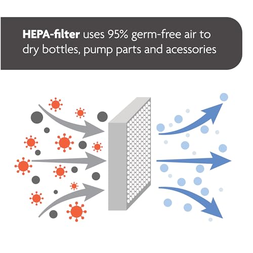 Kills 99.9% of germs: Uses natural steam to eliminate 99.9% of harmful bacteria, mold & the yeast that causes thrush, then dries automatically with HEPA-filtered, germ-free hot air; Products remain sterilized inside for 24 hours when left in unopened machine