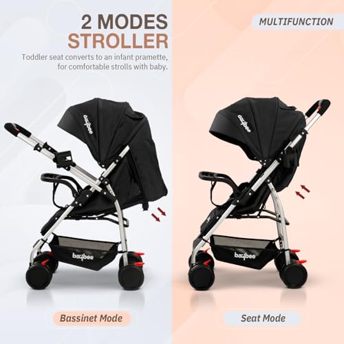 Baybee Convertible Infant Baby Pram Stroller for Newborn Babies with 3-Position Adjustable Seat & Canopy, Reversible Bassinet & 5 Point Safety Belt | Baby Stroller for Toddlers 0 to 3 Years Boy Girl (Black)