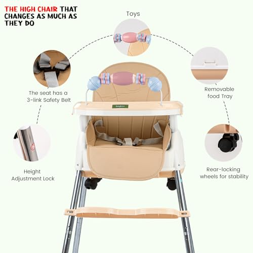 Baybee Nora 4 in 1 Convertible High Chair for Kids with Adjustable Height and Footrest, Baby Toddler Feeding Booster Seat with Tray, Wheels, Safety Belt and Cushion, 6 Months to 3 Years (Beige)