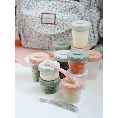 Beaba Set of 12 Storage Pots and 2 Silicone Weaning Spoons, Interlocking, Stackable Pots, 100% Airtight, Freezable, Breast Milk, 2 x 90 ml + 4 x 150 ml + 6 x 250ml, Eucalyptus