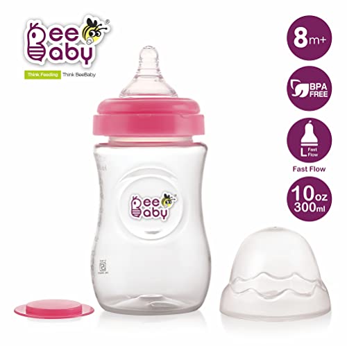 BeeBaby Ease Wide Neck Baby Feeding Bottle with Medium Flow Anti-Colic Soft Silicone Nipple/Teat. Infants/New Born/Toddlers. – 300 ML / 10 oz. | 100% BPA Free. (Pink) (Pack of 2) 8 Months +