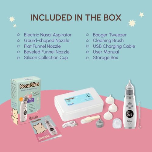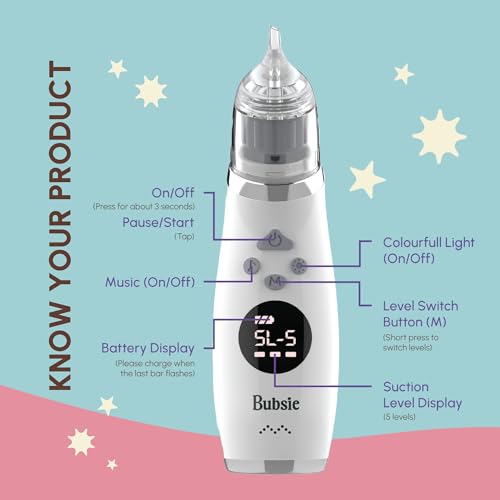 Bubsie NoseBliss Electric Nasal Aspirator | Baby Nose Aspirator with Self Cleaning, Music and Light Function | 5 Suction Levels | 3 Soft Silicon Nozzles | IPX6 Waterproof Booger Sucker for Infants with USB Charging | 1 year Warranty