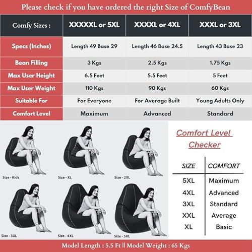 Product Dimensions : Length (25.5 In), Width (25.5 In), Height (46 In) .Please Refer To The Size Chart In The Images To Know Which Version Of Comfy Bean Suits You The Best.