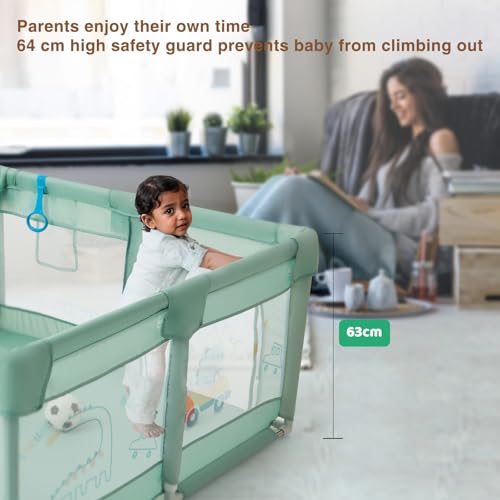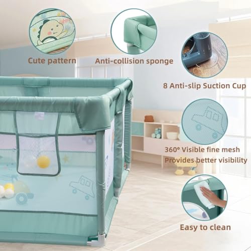 Dawnwake 120×120 cm Playpen for Baby up to 3 Years with Safety Lock & Anti-Fall Grasp Rings, and Suction Cup (Non-Foldable) – Green