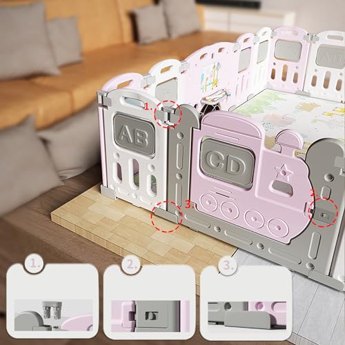 【Assembly-Free & Quick to Fold】Note: GENTLY LIFT ALL FENCE PLUGS to UNLOCK the fence before extending it. Foldable playpen, Space-saving. No assembly.