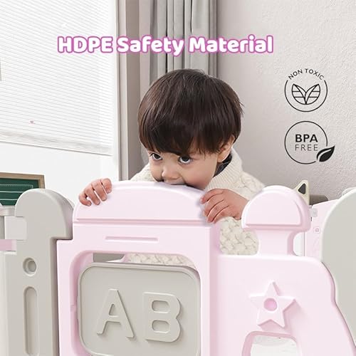 Dawnwake Assembly-Free 14 Panel Playard, Baby Playpen Fence with Crawling Mat and Football for Baby Upto 8 Years with Safety Locking Door & Drawing Board (150 x 150cm, Foldable) -Pink