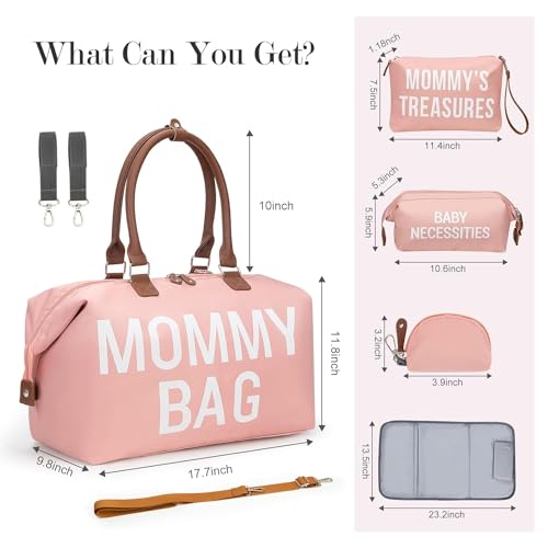 Dravina Diaper Bag for Moms, 5-Piece Set with Changing Pad, Pacifier Holder, 2 Storage Pouches & Luggage Sleeve, Stylish Maternity Backpack for Travel, Baby Essentials Organizer (Pink)