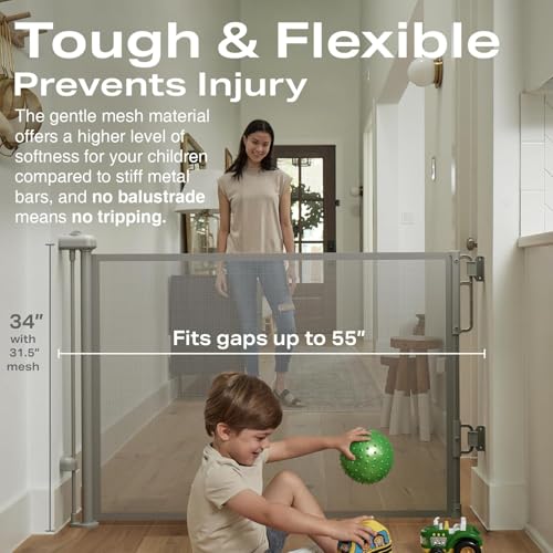 GBEX Retractable Mesh Baby Gate or Dog Gate, Child Safety Gate for Indoor or Outdoor, 33-inches Tall with up to 55-inches Wide Extension, Avoid Skirting Installation, Grey