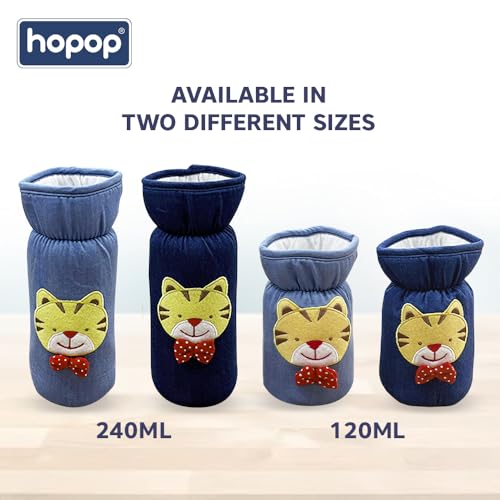 Hopop Baby Feeding Bottle Cover | Soft Denim Wide Neck Baby Bottle Cover with Easy to Hold Strap | Cute Animated Patterned | Hold Up to 120 ml Bottle | Small