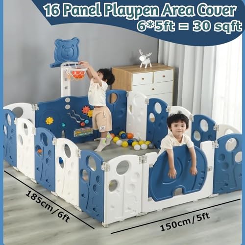 Hukimoyo 16 Panel Playpen for Babies Upto 5 Years with Mat , Balls and Safety Lock , Kids Fence Baby Play Area Indoor Setup Foldable Playard Play Pen For Kids Toddlers Playards Children Baby Play Area Play Yard Fence (5.2 * 6.1 FT=30 SQFT)