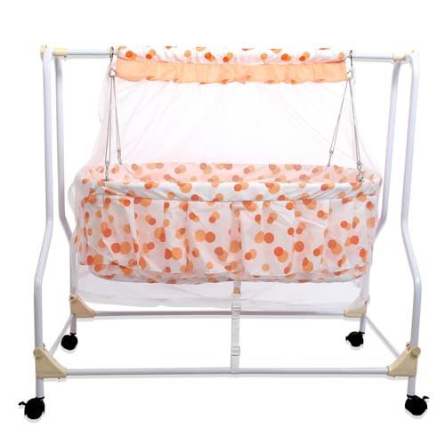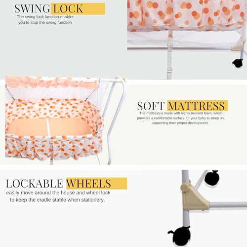 Infanto Cocoon Baby Cradle | Palna | Jhula – Sturdy Metal Frame, Mosquito Protection Net, Lockable Wheels, Swing Lock, Soft Fabric – Orange