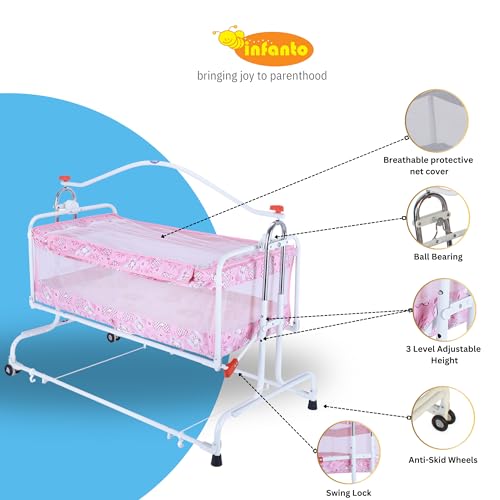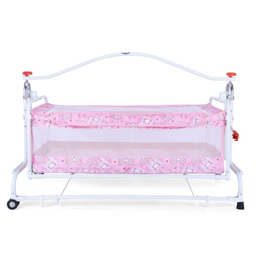 Infanto Compact Baby Cradle, Jhula, Palna, Swing – Adjustable Height, Sturdy Frame, Smooth Swing, Secure Lock, Anti-Skid Pad, Breathable Net, Sturdy Build – CC29-STD (Pink)