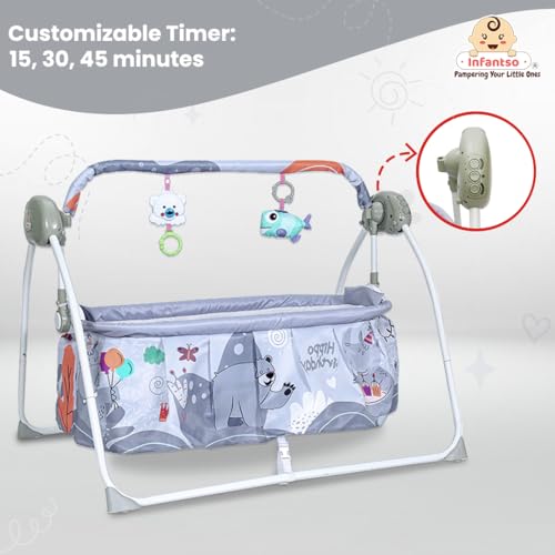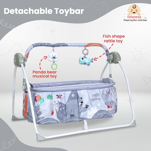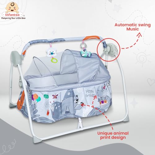 Infantso Baby Cradle Automatic Swing with 3 Point Safety Harness, Remote Control, Hanging Toys, Mosquito Net, Soothing Lullabies Music, Extra Cushion for 0-2 Years Baby Boys and Girls (Grey, Animal)