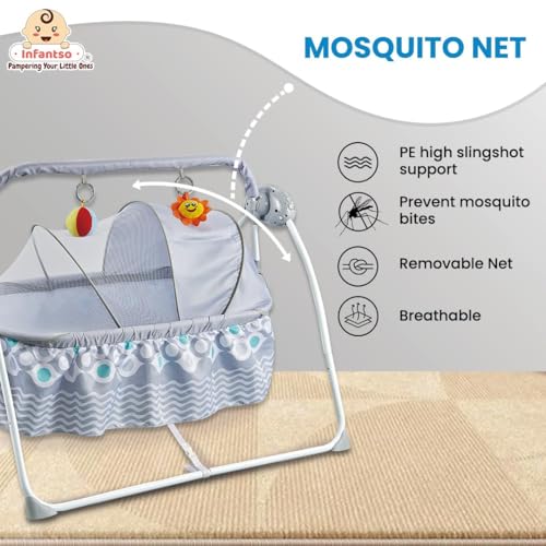 Infantso Baby Cradle Swing with 3 Point Safety Harness, Hanging Toys, Soothing Lullabies Music, Extra Cushion for 0-2 Years Baby Boys and Girls Baby Jhula (Grey, Chevron)