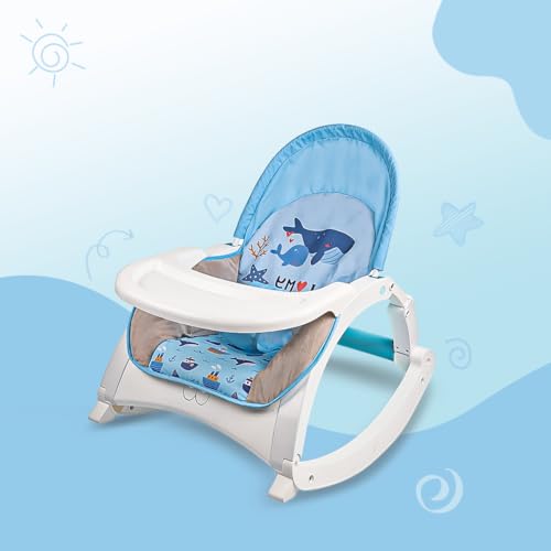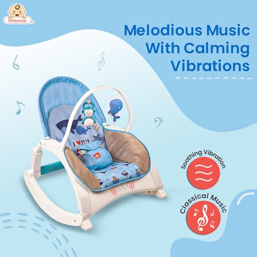 INFANTSO Baby Rocker & Bouncer for 0 to 2 Years (Blue), Chair for Newborn with Neck Pillow, Calming Vibrations, Music & Toys, 3 Position Adjustable Backrest Swing with Feeding Tray