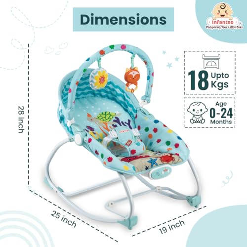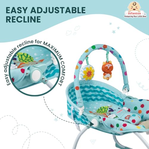 Soft Cushion Back and Adjustable Recliner: Ensuring optimum comfort for your little one, Infantso’s baby rocker boasts a soft cushion back and adjustable two-position seat recliner. The plush cushioning provides gentle support, cradling the baby in comfort during playtime or naptime. Additionally, the adjustable recliner allows parents to customize the seating position to suit the baby’s needs, ensuring a cozy and relaxing experience every time.
