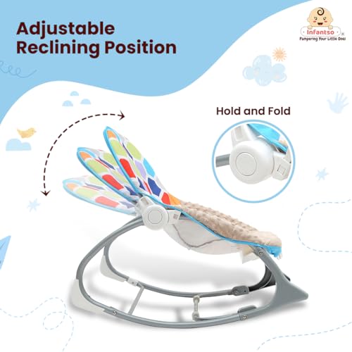 Soft Cushion Back and Adjustable Recliner: Ensuring optimum comfort for your little one, Infantso’s baby rocker boasts a soft cushion back and adjustable two-position seat recliner. The plush cushioning provides gentle support, cradling the baby in comfort during playtime or naptime. Additionally, the adjustable recliner allows parents to customize the seating position to suit the baby’s needs, ensuring a cozy and relaxing experience every time.