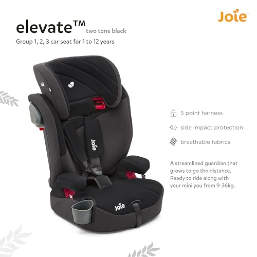 Joie Elevate Group 1/2/3 Car Seat, Suitable for 1 to 12 Years, Side Impact Protection, Ventilated Mesh Sides, Integrated Cupholder, 10 Position Headrest, 5 Point Grow Together Harness System