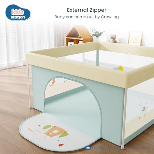 Kids Station Foldable Baby Playard Playpen – Thick Padding & 360° Mesh Visibility – Play Gate Fence for Toddlers – Storage Pocket and Smart Folding & Portable Baby Activity with Suction Cup – Suitable for Children – Baby Safety Essentials – 5ftx5ft or 150x150cm (Green)