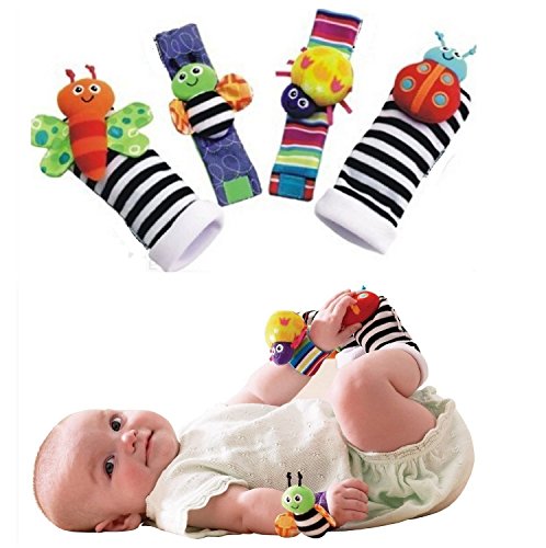 Kuhu Creations® Cute & Stylish Soft Baby Rattles. (4 Units, Style D: Multicolor 2 Wrist & 2 Foot Rattle)