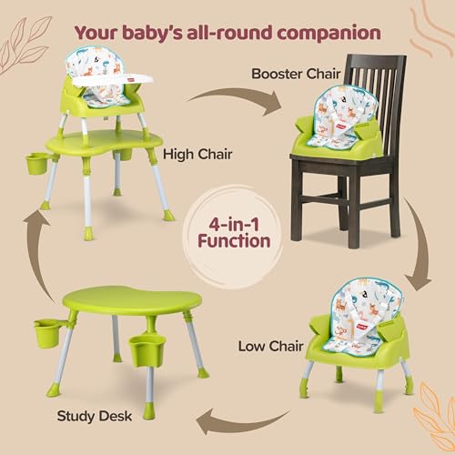 LuvLap 4 in 1 Convertible Baby High Chair with Printed Cushion, 3 Point Safety Belts, High Chair, Low Chair, Booster Chair and Table for Baby, Removable & Washable Food Tray 6 Months+, Green