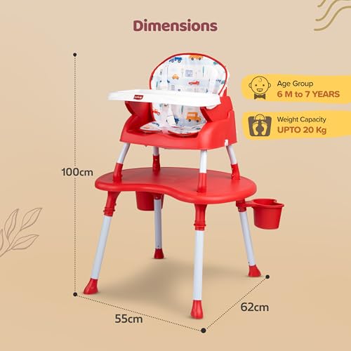 LuvLap 4 in 1 Convertible Baby High Chair with Printed Cushion, 5 Point Safety Belts, High Chair, Low Chair, Booster Chair and Table for Baby, Removable & Washable Food Tray 6 Months+, Red