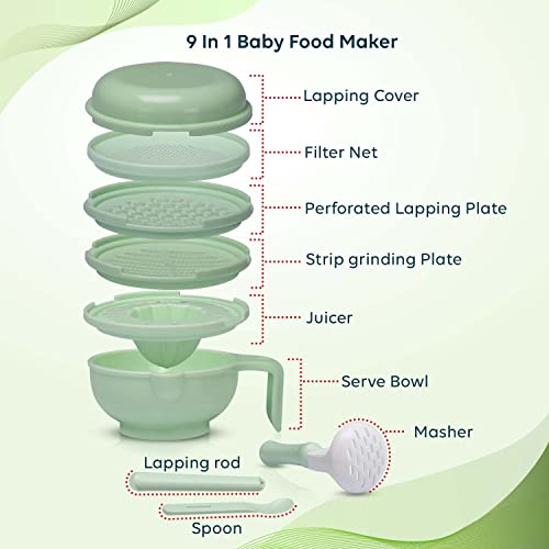 LuvLap 9 in 1 Baby Food Masher Mill, Food Grinder Cum Processor, with Multifunction Textured Mashing & Filtering Plates, with Serving Bowl (Light Green)