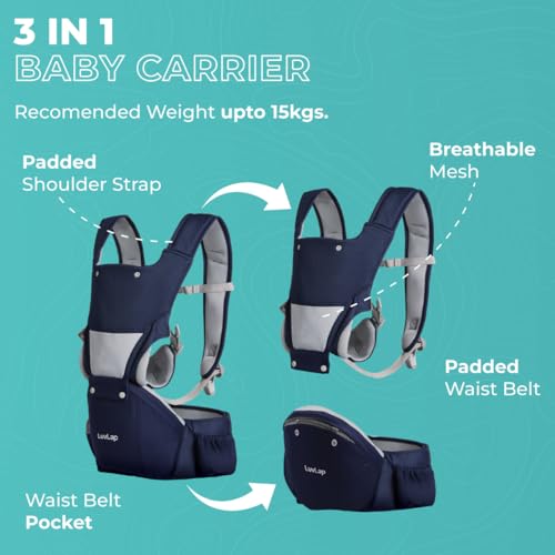 LuvLap Comfy Newborn Baby Carrier with Detachable Hip Seat (3 in 1), Ergonomically Designed (6-24 Months), 6 Baby Carrying Modes, Carrying Capacity 15Kg, Blue