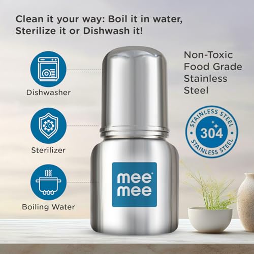 Mee Mee Baby Steel Feeding Bottle 120ml | Baby Milk Bottle with Advanced Anti Colic Valve, BPA Free, Soft Silicone Teat, Slim Neck for Babies/Infants/Newborns of 0-2 Years
