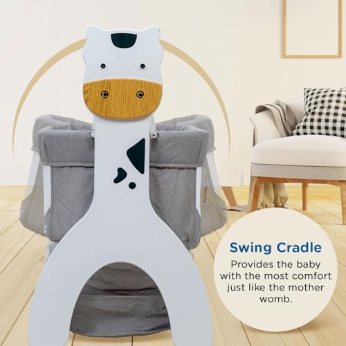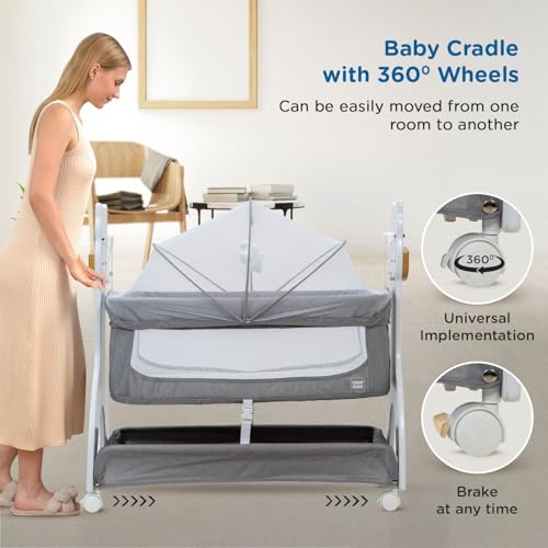 Mee Mee Manual Swing Cradle for Newborn Baby with Mosquito Net & Mattress Pad, Cot Bassinet with Wheel Lock for Kids 0-18 Month Infants| Carries up to 15kgs (Grey)