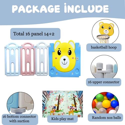 Metreno 16 panel Baby Play Area Indoor Setup Playpen for Babies upto 5 year Foldable Play Yard Fence for Toddlers Kids Playarea Setup Outdoor Children Play Area with Gate, Balls, Basketball Stand, mat (5*6ft=30sqft)