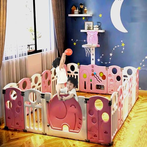 Metreno 18 Panel Baby Play Area Indoor Setup Playpen for Babies upto 5 year Foldable Play Yard Fence for Toddlers Kids Playarea Setup Outdoor Children Play Area with Gate, Balls, Basketball Stand, mat (6 * 6 FT=36 SQFT, pink)