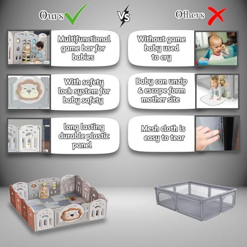 【panels provide】; space for your baby to play and explore, so you can keep them safe and entertained. Safety lock ensures that the playpen stays securely closed, so you can have peace of mind while your child is playing.