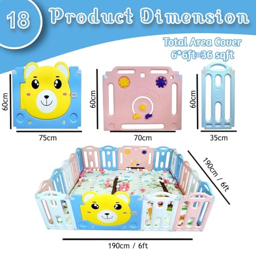 【Safety Material & Non-slip Design】:18 Panel size 215*175*60CM 6*6 FT= 36 SQFT Baby playpen is made of HDPE plastic, durable, lightweight, waterproof, easy to clean. The non-slip rubber pads on the bottom make it difficult to tip over and move. The playpen also comes with extra suction cups that can be attached according to your needs