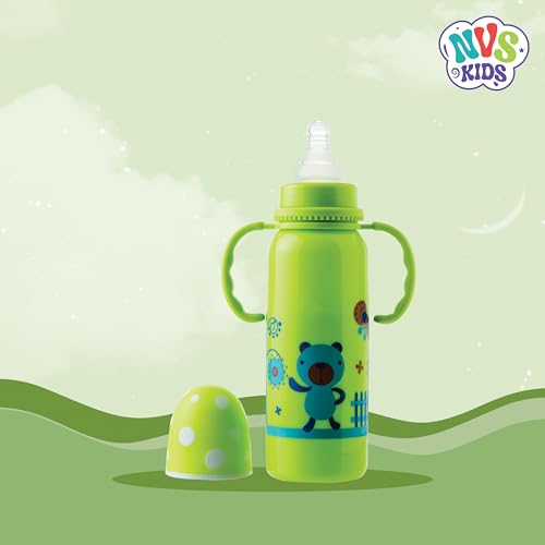 NVS KIDS Baby Feeding Bottle 240ml Leak Proof Anti Spill Bottle Dust Free Cover Green Color Kids with Soft Silicone Spout BPA Free for New Born/Infants/Toddler Upto 3 Years