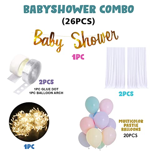 LATEST AND EXCLUSIVE BABY SHOWER DECORATION ITEMS: This curated set includes 2pcs White Decoration Net (Size: 170 x 60 inch Approx.), 1pc golden baby shower foil banner, 20pcs multicolor pastel balloons, 1pc LED fairy lights with 1pc glue dot & 1pc balloon arch, fulfilling the demands of Party Propz customers.