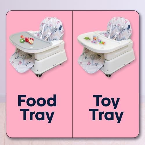 POLKA TOTS 4 in 1 High Chair For Baby Of 1-3 Years (Heart Print), Multiple Recline Position With 7 Adjustable Height Level, Detachable Feeding Tray For Toddlers With Footrest, Extra Cushioning & Wheels
