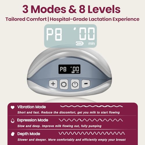 【Effortless & Comfortable Hands-Free Pumping】- Enjoy effortless and comfortable hands-free pumping with 3 customizable modes (Suction, Massage, Stimulation) and 8 adjustable suction levels. The pump is designed to mimic a baby’s natural sucking pattern, ensuring a smooth and efficient pumping experience