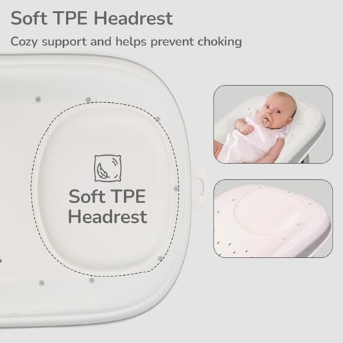 Ergonomic Support: Its baby-friendly design supports healthy spine development without affecting the spinal posture during the bathing time. Also, the TPE material headrest provides efficient support for the head and neck of the child.
