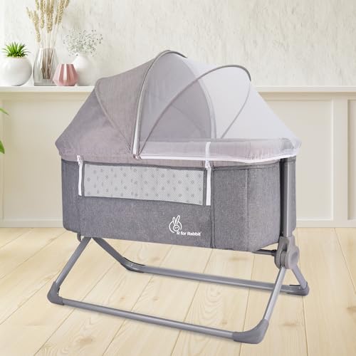 R for Rabbit Hop A Little Baby Cot Bedside Bassinet for Kids | 4 Level Height Adjustment Crib with Breathable Mesh for 0 to 12 Months Infant Weight Capacity Upto 20kgs (Dark Grey)