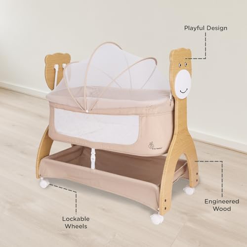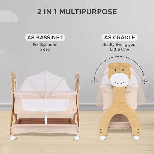 R for Rabbit Lullabies Woodsy 2 in 1 Manual Swing Wooden Cradle Newborn Baby Convertible Cot Bassinet with Mosquito Net, Lockable Wheels & Storage Space for Kids 0-12 Months, Upto 12 Kg (Beige)