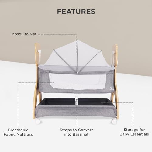 R for Rabbit Lullabies Woodsy 2 in 1 Manual Swing Wooden Cradle Newborn Baby Convertible Cot Bassinet with Mosquito Net, Lockable Wheels & Storage Space for Kids 0-12 Months, Upto 12 Kg (Dark Grey)