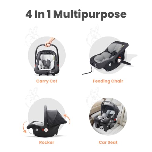 R for Rabbit Picaboo Grand 4 in 1 Multi Purpose Baby Carry Cot Cum Car Seat with 3 Level Recline Position and Detachable Base Carry cot for 0 to 15 Months Baby (Black Grey)