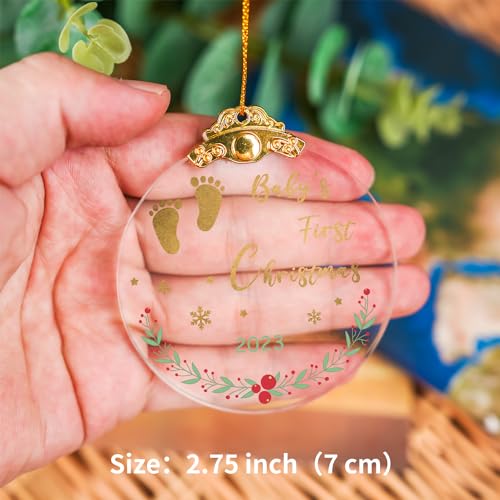 PRETTY DESIGN:This is a crystal circle ornament with a diameter of 2.75 inches. Printed colorful pattern and funny saying: “Baby’s First Christmas Ornament 2023”. The elegant printed design style makes ornaments look more textured.