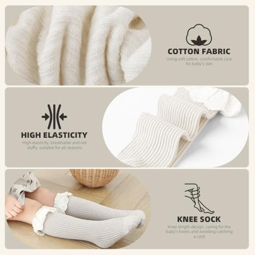 CUTE LACE EDGE DESIGN: Adorned with an adorable lace edge, these white socks for girls add a touch of cuteness to any baby outfit. The delicate lace patterns provide a stylish finish thats perfect for special occasions or everyday wear, making your little one look even more charming.