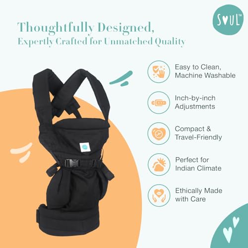 Soulslings 4-in-1 Lali Baby Carrier Bag, 100% Cotton – Black | Compact & Lightweight (400g) | Adjustable for 0-24 Months (4-15kg) | Machine Washable & Handwashable | Breastfeeding Friendly