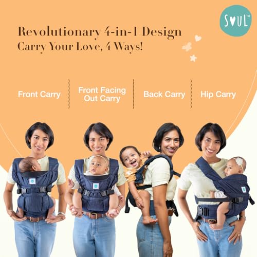 Soulslings 4-in-1 Lali Baby Carrier Bag, 100% Cotton – Dark Blue | Compact & Lightweight (400g) | Adjustable for 0-24 Months (4-15kg) | Machine Washable & Handwashable | Breastfeeding Friendly