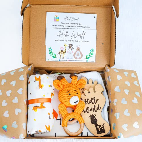 The Baby First Box New Born Newborn Bundle: Onesie, Muslin Swaddle, Crochet Rattle, Teething Ring, And Baby Announcement Plaque|Baby Shower Gifts|Baby Gift Hamper|Pack Of 5,Yellow
